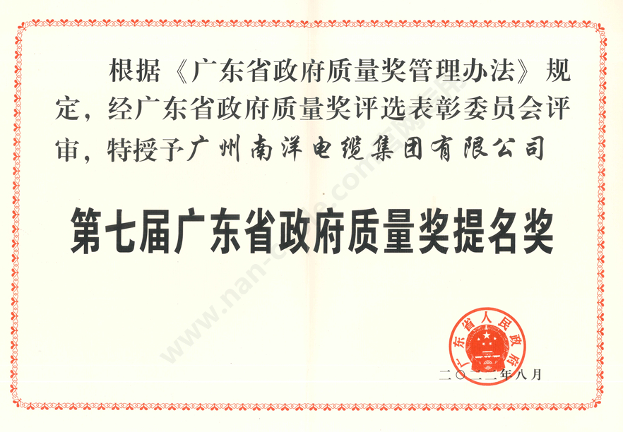 • 第七屆廣東省政府質(zhì)量提名獎(jiǎng)證書
